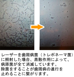 レーザーを歯ぐきの患部に照射して、炎症の原因となっている歯周病菌(トレポネーマ菌等)を直接的に蒸散、死滅させ、炎症を抑え、更に歯周病菌が再繁殖するのを防ぎます。