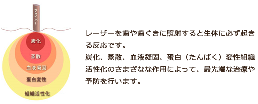 ○ 歯を残す・守るための治療機は嬉しい炭酸ガスレーザーをパルス波として患部に照射するこの方法は、局所麻酔や注射などを必要としない痛みのない治療方法です。