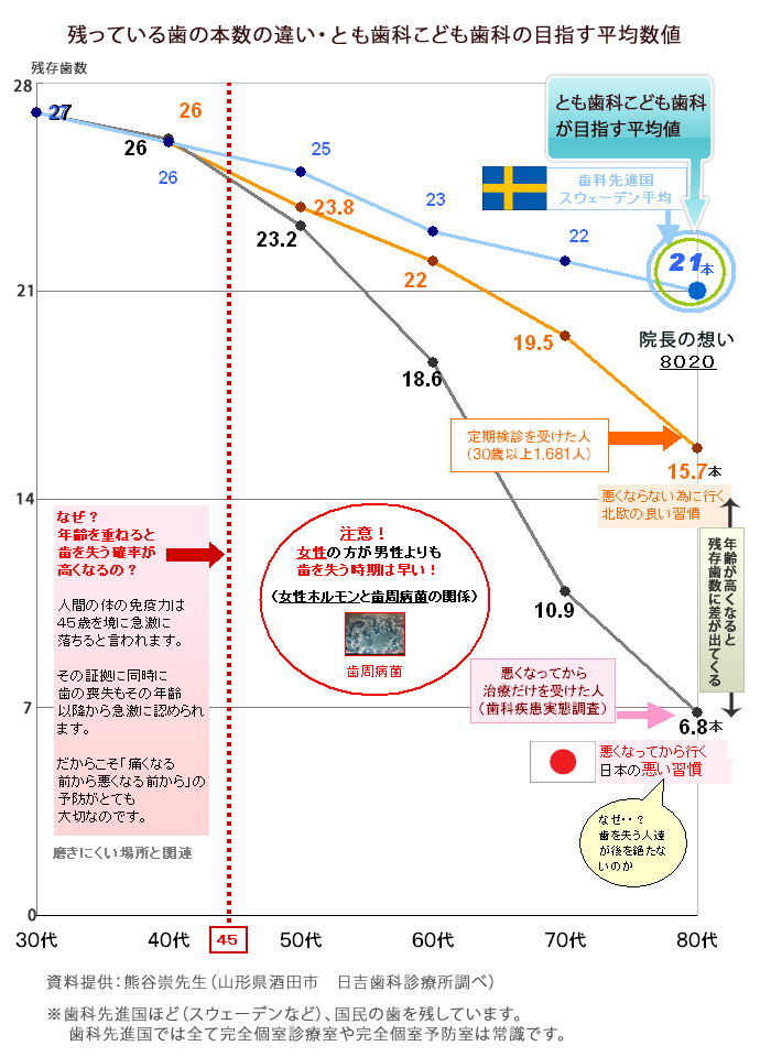 当時30~50代だった 患者さんが、正しい自己管理によるブラッシング(セルフケア)と個々のリスクに応じた定期健診・歯石取り・PMTC(プロフェッショナルケア) を続け、30年後の60~80代になったときの残存歯数を比較しています。